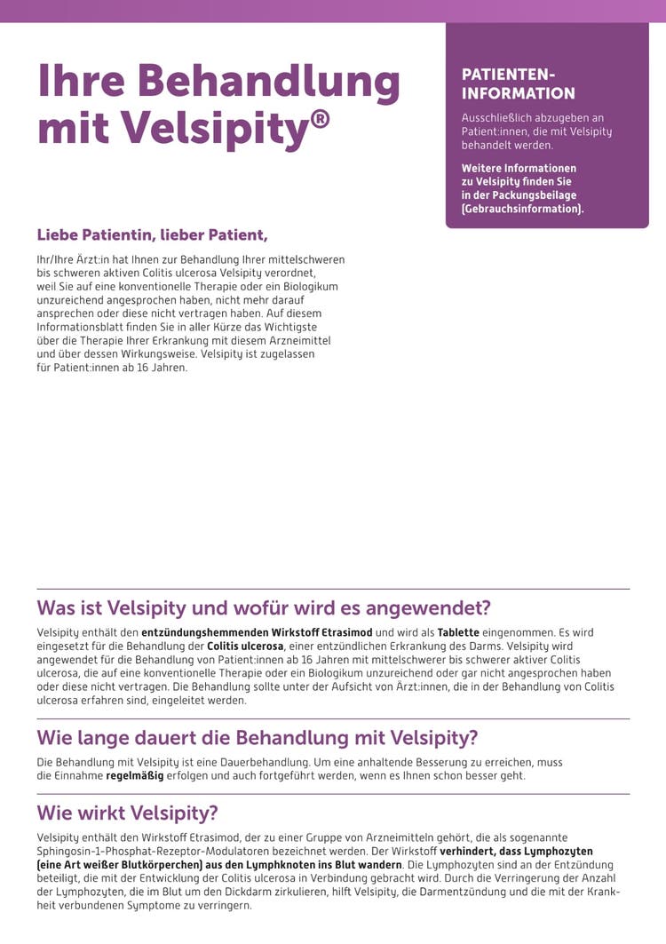 Die vorliegende Webseite wurde erstellt für Patient:innen mit Colitis ulcerosa, denen von ihrem Arzt oder ihrer Ärztin VELSIPITY® verordnet wurde.